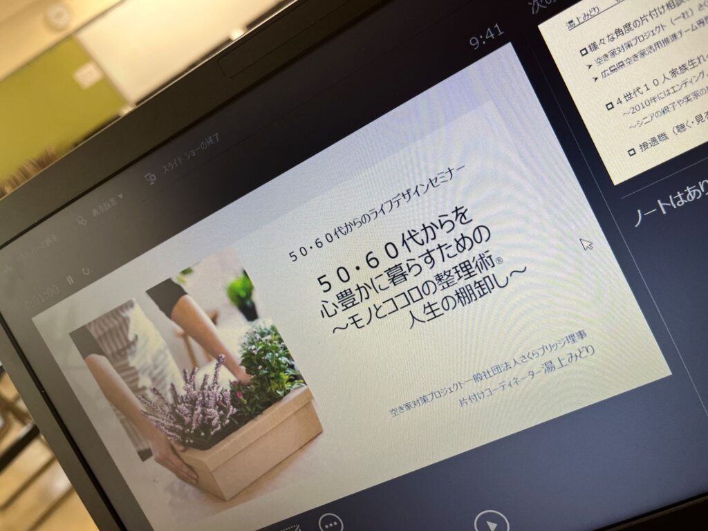 高齢者のモノの整理や終活、親子のコミュニケーション等、暮らし目線の声を活かしたシニア層と親子を中心の「片付け・終活」「実家・空き家の課題」などの講演です。